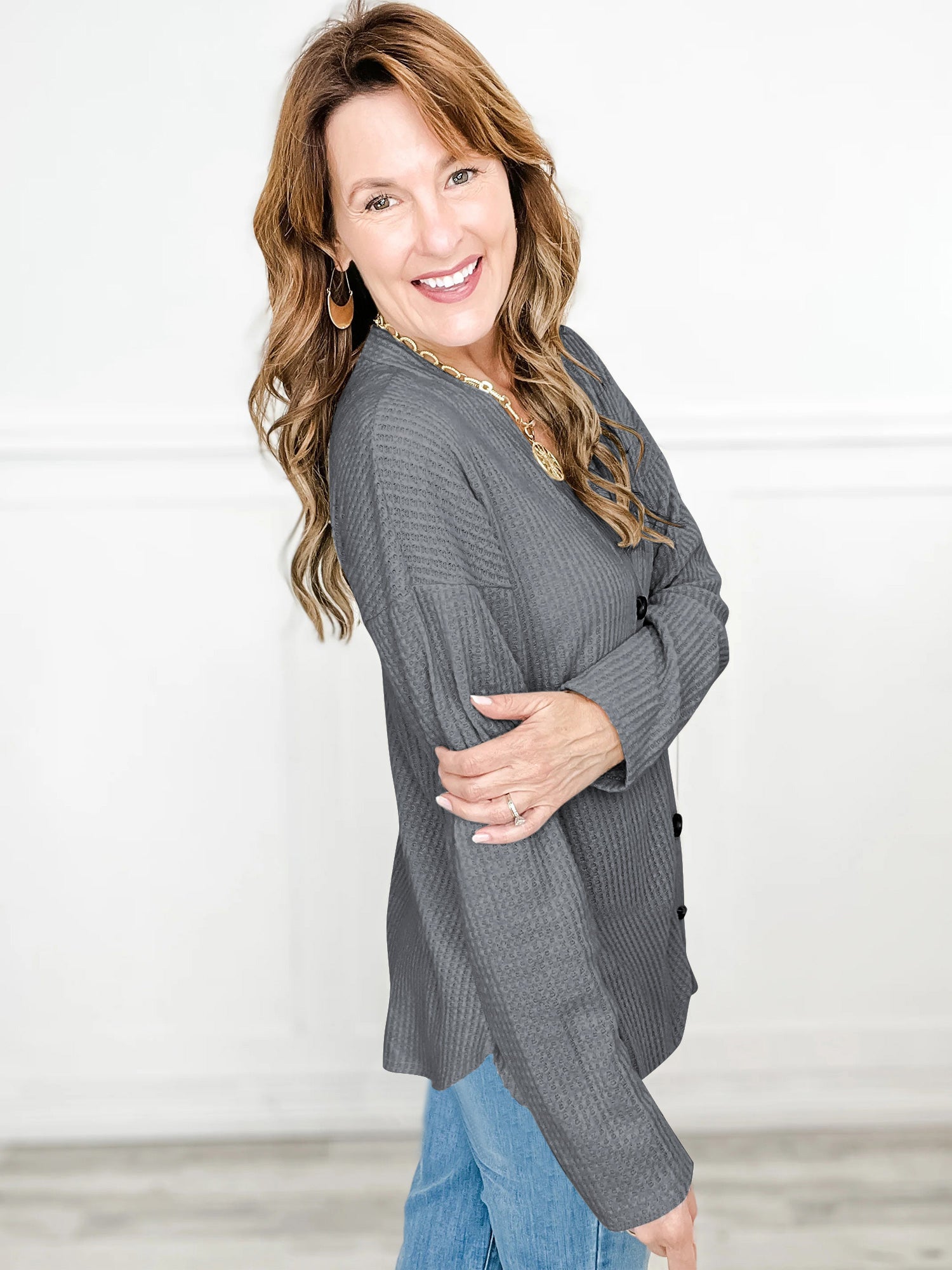 SHIBEVER Women Tops Fall Long Sleeve Shirts for Women Buttons Up V Neck Waffle Knit Lightweight Open Front Cardigan for Women Winter Clothes Grey