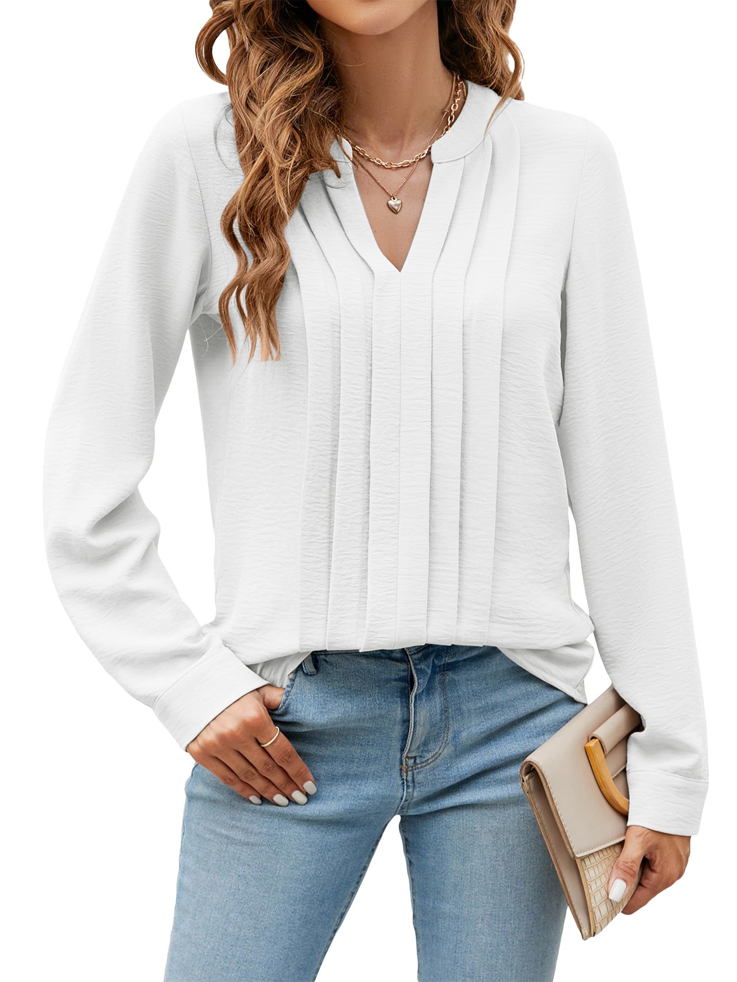 TEMOFON Womens Dressy Casual Blouses Business Work Tops Long Sleeve V Neck Pleated Shirts for Womens Clothes Fall Outfits Lightweight Tunic Tops
